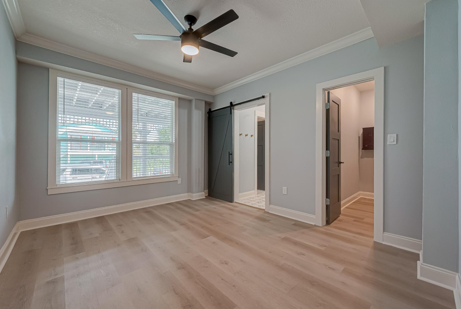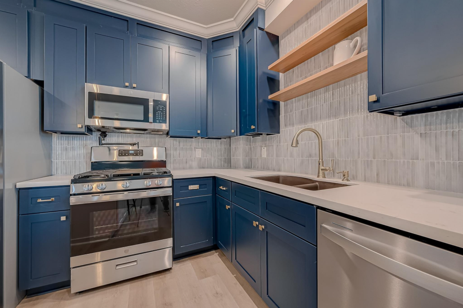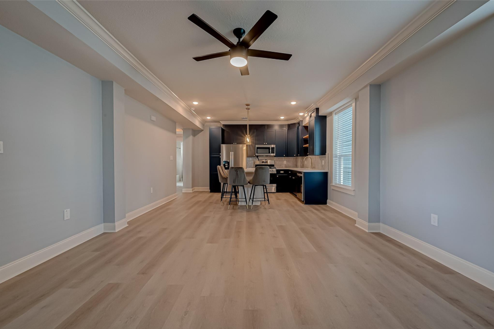 Welcome to this beautifully remodeled downstairs unit just minutes from the Galveston shoreline. Hear the waves from your expansive front deck!! PERFECT FOR UTMB STUDENTS!! This 3/2 full home was thoughtfully updated from the studs up and offers high ceilings, crown molding, and an open living and dining layout that feels bright and inviting. The kitchen shines with quartz countertops, rich blue soft close cabinetry, a gas range, SS appliances, and a spacious island perfect for everyday living or entertaining. The primary suite features an en-suite bath with double sinks, a separate enclosed shower, and a walk-in closet. The secondary bath includes a jetted tub and the convenience of an in-unit washer and dryer. Enjoy relaxing on the oversized covered front porch just blocks from the beach. One garage space available. A wonderful opportunity to enjoy easy coastal living. **$75/month water utility reimbursement fee**