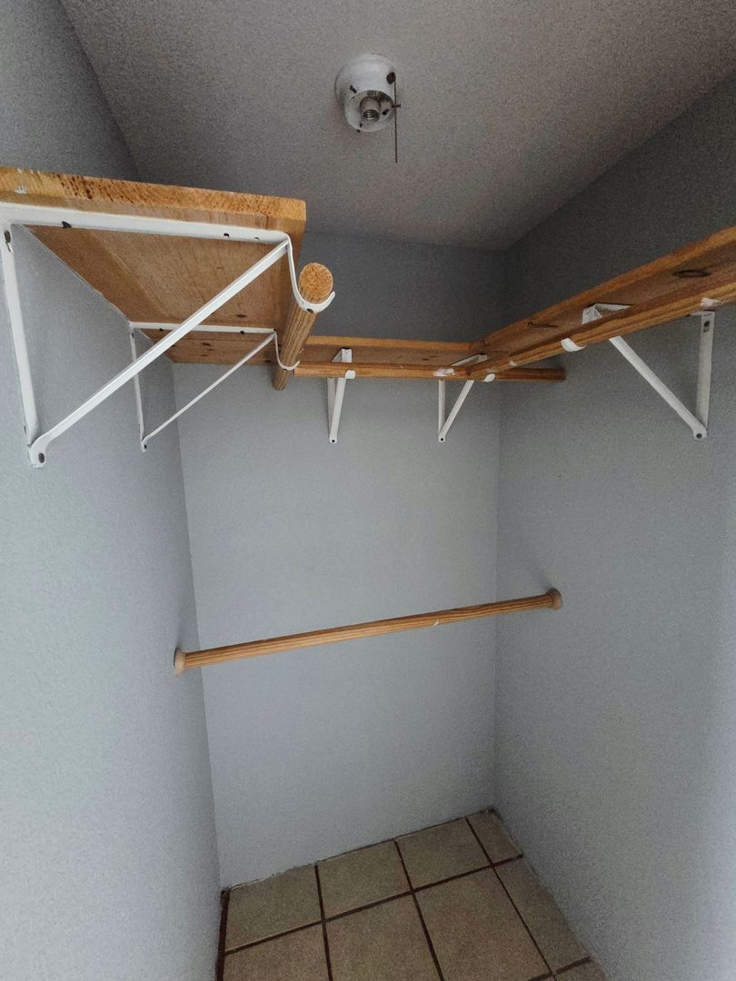 Step into a cozy living area that opens to a functional kitchen equipped with a full-size refrigerator, electric stove, ample cabinet storage, and built-in shelving. The bedroom includes a spacious walk-in closet, and the bathroom provides a tiled walk-in shower with simple, easy-to-maintain finishes.